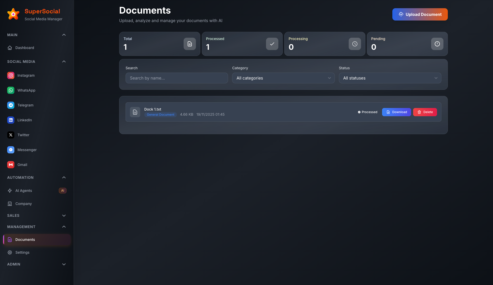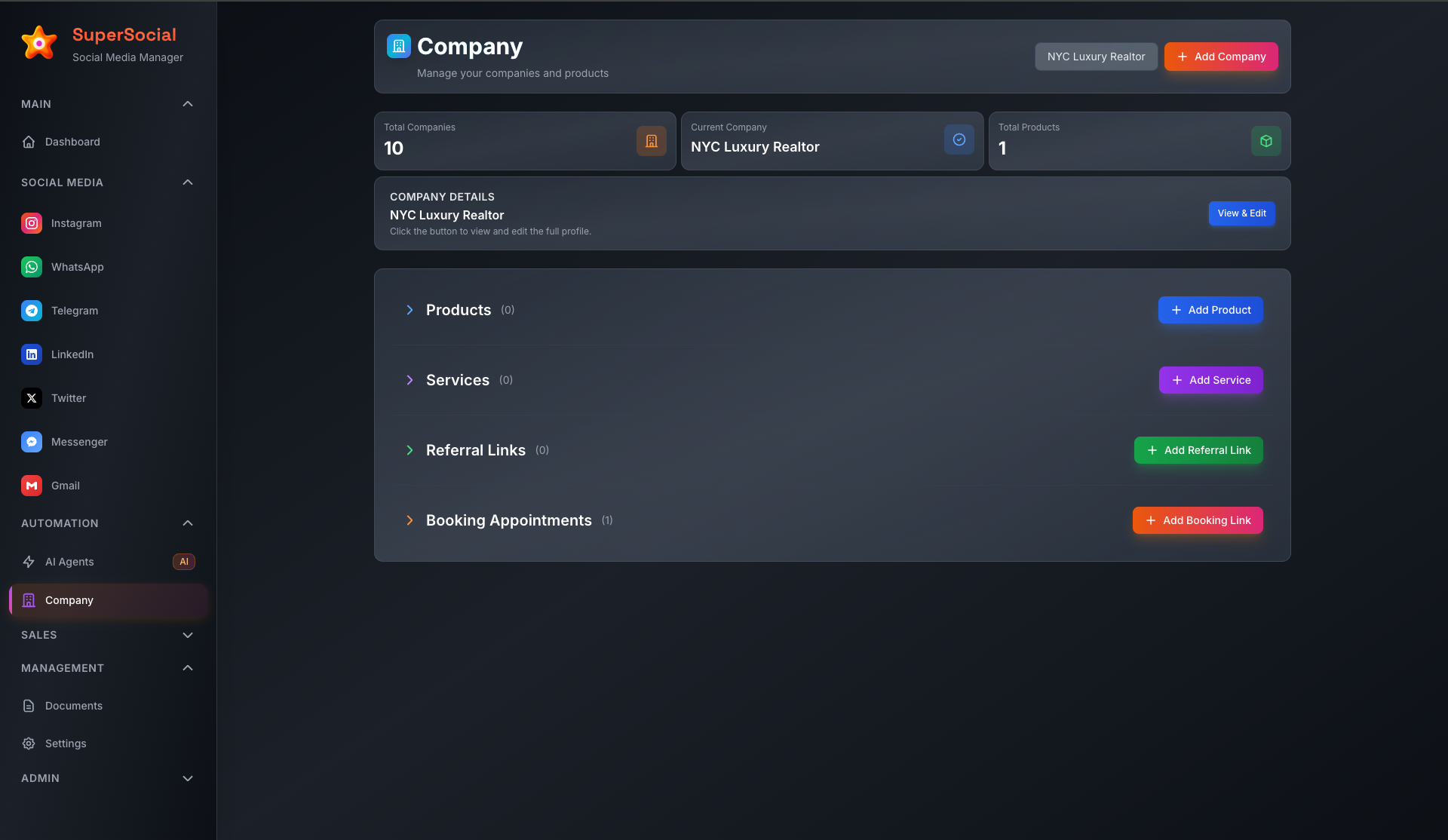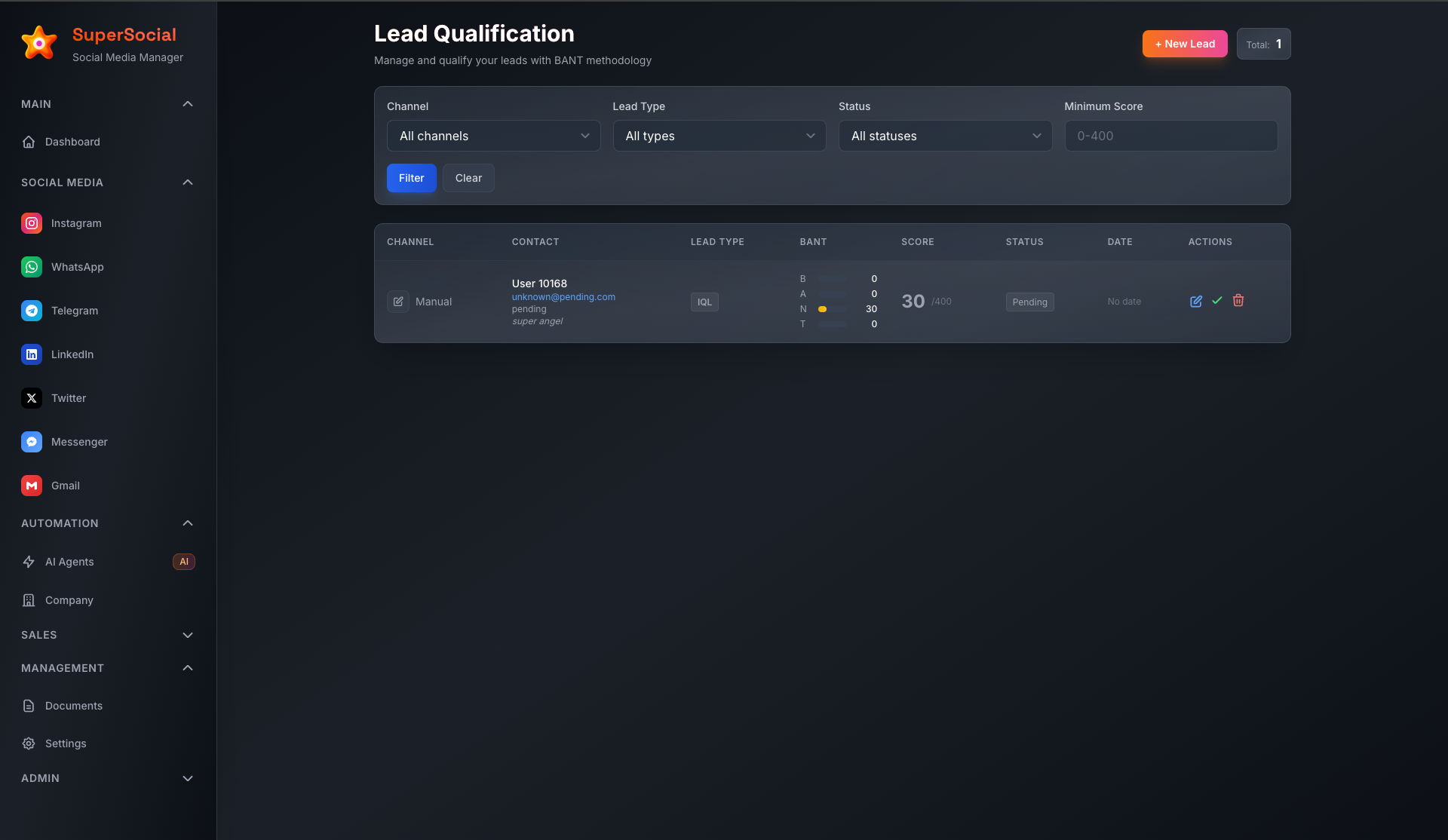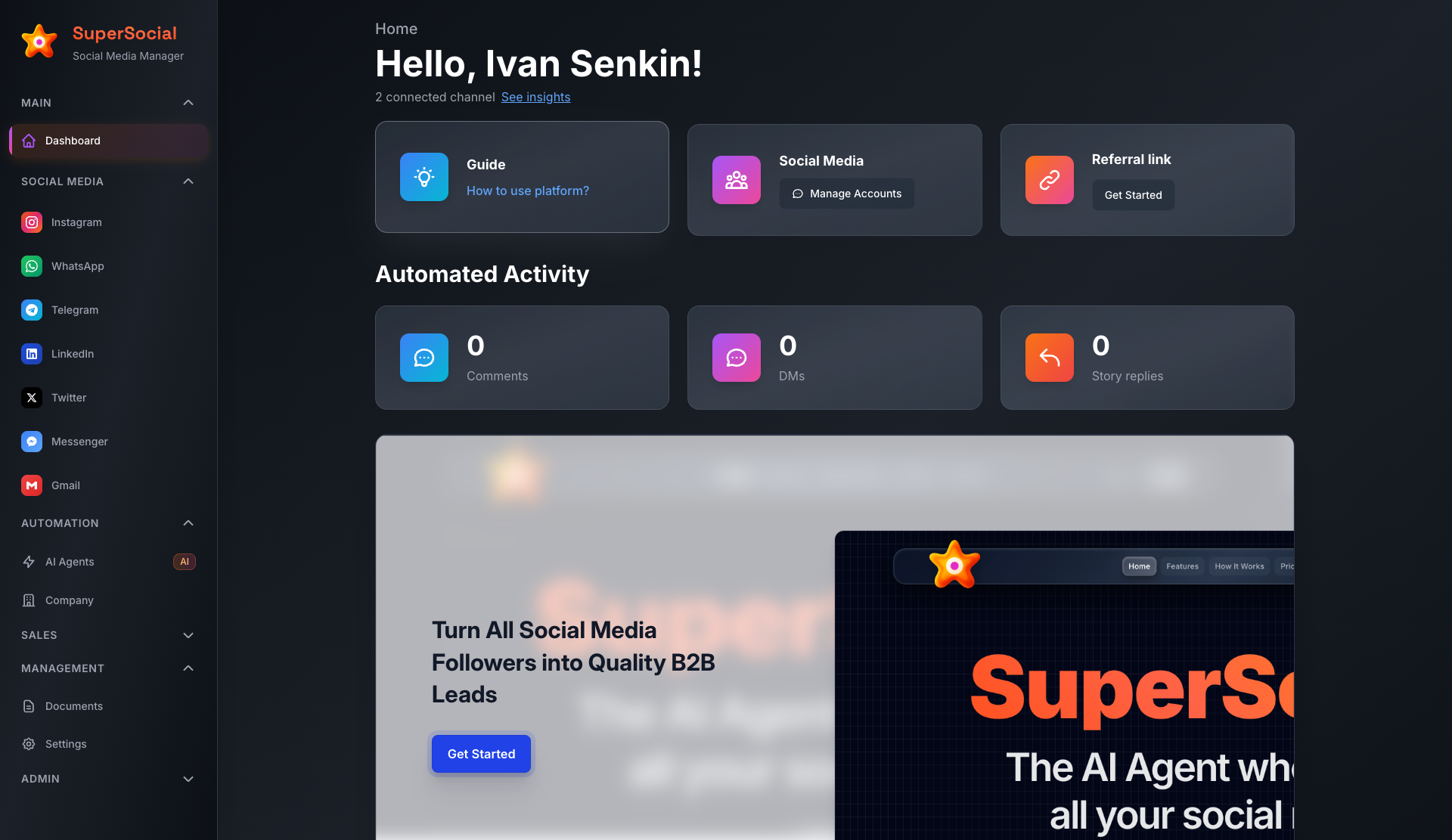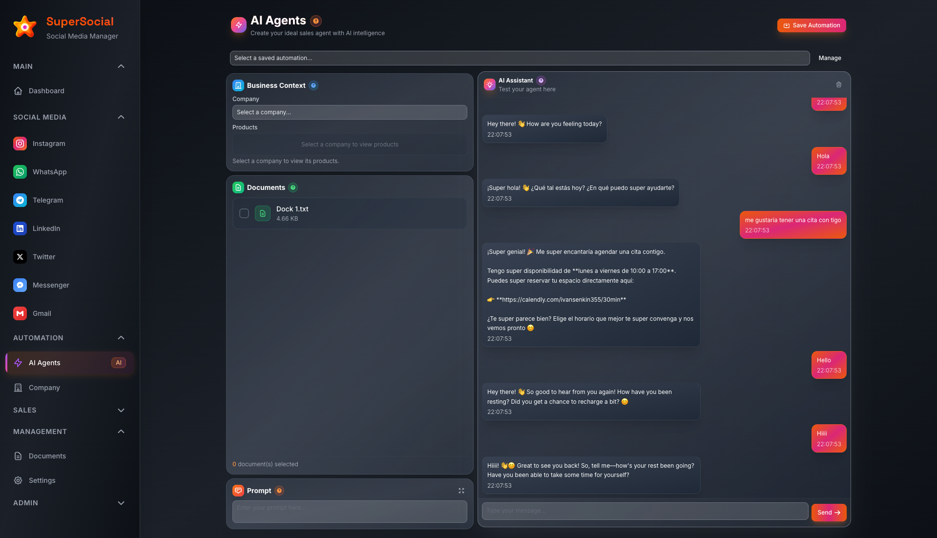 SuperSocial es una plataforma de agentes de IA autónomos que se entrenan con el contexto de tu negocio. Interactúan con clientes, cualifican leads, agendan reuniones y cierran ventas de forma simultánea en todos tus canales sociales.